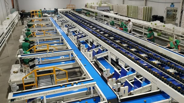 Vincent Zhang, gerente de ventas regional, presenta esta línea procesadora: "Se trata de un proyecto de clasificación de cinco carriles que consta de una calibradora principal de cuatro carriles y una calibradora secundaria de un solo carril. La capacidad de la clasificadora principal podría llegar a las 10 toneladas por hora. La línea clasificadora tiene cinco funciones: clasificación por peso, tamaño, forma, color y defectos. Todas ellas se pueden usar en combinación".