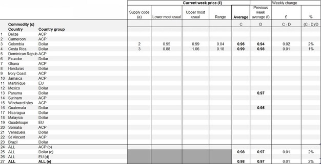 Del mismo modo, las bananas de Costa Rica han experimentado un pequeño aumento en su precio medio, pasando de 0,98 libras a 0,99 libras por kilogramo entre la semana 6 y la 7. Esta subida de 0,01 libras representa un aumento del 1%, lo que indica una tendencia marginal al alza. El rango de precios para la banana costarricense va de 0,88 a 1,06 libras por kilogramo, mostrando una fluctuación más amplia comparada con Colombia. Esto podría deberse a una variación en la calidad, a la consistencia del suministro o a factores de transporte que afectan a la fijación de precios.
