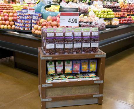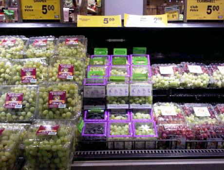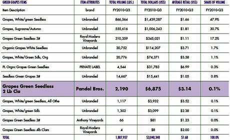 Al final de su presentación comparó el volumen total y el valor en dólares de diferentes tipos de uvas blancas y negras (venta en "cubo de enjuague rápido', con etiqueta sin marca o marca privada), destacando cómo el 'cubo de enjuague rápido' permite el mayor ahorro de espacio y la mayor ganancia en ventas al por menor (abajo: lista de uvas blancas).