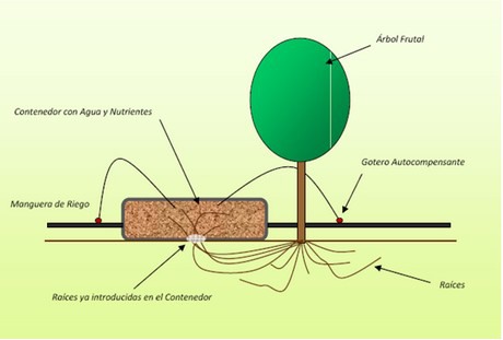 Se trata de un sistema de riego caracterizado por un contenedor diseñado especialmente de material plástico, impermeable, de coloración negra en su interior y resistente varios años (protección a la degradación por los rayos UV del sol) que se coloca en las proximidades del tronco del árbol y que a través del riego a goteo, se distribuye en su interior toda el agua y nutrientes por medio del sistema de fertirrigación , consiguiendo que las raíces del árbol, penetren a través de una abertura especialmente habilitada y protegida de la luz solar.