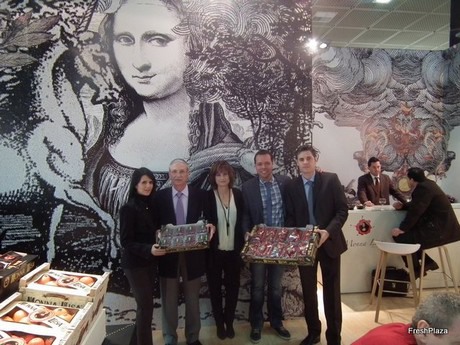 Stand de Hispalco en Fruit Logistica 2013. De izquierda a derecha: Natascia Spartani, Responsable de calidad; José Beltrán,