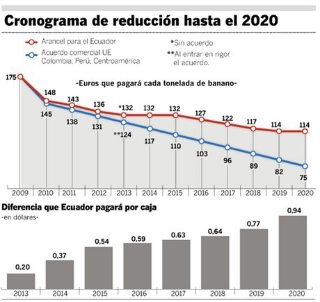 Perú y Colombia, así como otros países centroamericanos, firmaron un acuerdo comercial con la UE para establecer una reducción progresiva del precio del arancel, por lo que, dentro de unos seis años, la diferencia de precio por tonelada podría ser de unos 50€, restanto mucha competitividad a Ecuador.