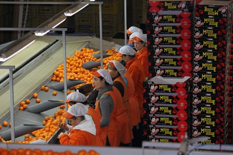 Trabajadoras encajando clementinas con la marca Meine Süsse.