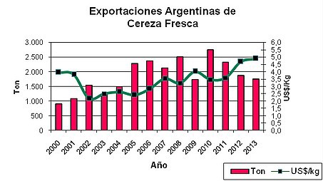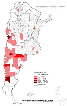 La producción de cereza exportable de Argentina se ubica en la Patagonia (70% -90%) y en la provincia de Mendoza. En línea recta, de norte a sur, hay unos 2.400 kilómetros distancia entre las norteñas plantaciones de la provincia mendocina y el centro más austral de producción, ubicado en la provincia de Santa Cruz. Este abanico de latitudes le permite a la Argentina tener una prolongada cosecha.