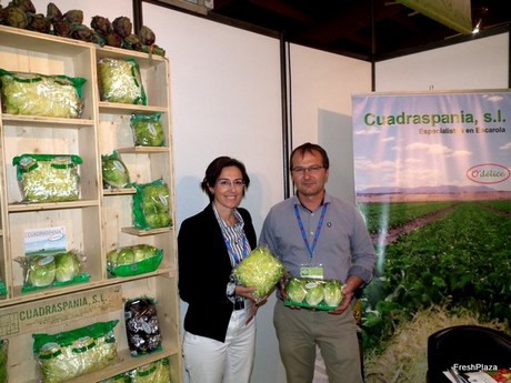 Joséphine Cuadras y Antoine Cuadras, en su estand de Cuadraspania, S.L., promocionando sus escarolas, lechugas y alcachofas en la feria internacional de MedFEL, en Perpiñán.