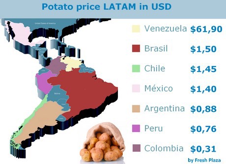 En Venezuela la papa se vende al público en precios que oscilan entre 250 y 390 bolívares, lo que según el cambio oficial significaría unos 61,90 dólares. Un valor ridículo y que casi duplica el salario mínimo diario de 224 bolívares que los trabajadores venezolanos perciben; aunque vale destacar que el tipo de cambio oficial de 6,3 bolívares por dólar dista mucho del valor en los mercados paralelos, el cual es de unos 390 bolívares por dólar.