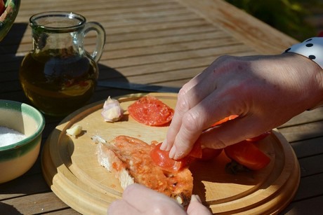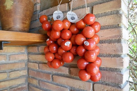 El tomate de colgar no es el típico tomate que puede encontrarse en todas las cadenas de supermercados. Estos tomates se cultivan siguiendo los métodos tradicionales, entutorado en cañas al aire libre, como se hacía antiguamente. Son perfectos para el tradicional desayuno o almuerzo catalán, el “pa amb tomàquet”, es decir, pan con tomate restregado, aceite de oliva, sal, ajo y jamón. Son tomates con muy poca piel, mucho jugo y una larga vida útil, ya que puede aguantar más de tres meses en perfectas condiciones sin necesidad de frigorífico. Además, también se usan mucho en los sofritos para la elaboración de paella y guisos tradicionales.