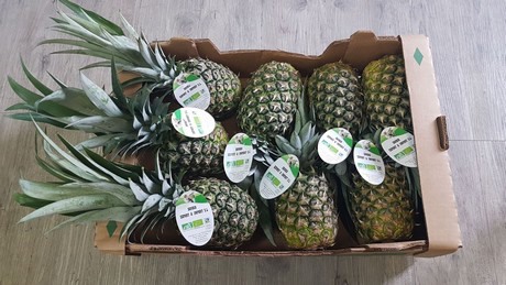 “A finales de la semana pasada recibimos las primeras piñas ecológicas de Costa Rica MD2 etiquetadas con nuestra propia marca, las cuales acaban de salir al mercado. Somos una de las primeras empresas en etiquetar la piña ecológica importada con nuestra propia marca, la cual se envasa ya en Costa Rica ”, cuenta Sonia López, gerente de Sonbio Export Import.