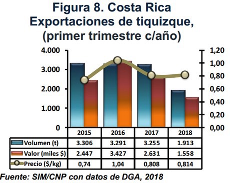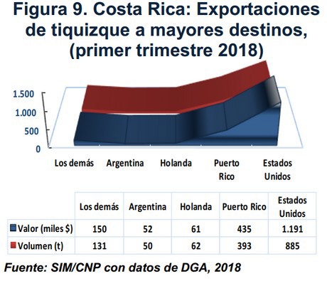 De enero a marzo del 2018, el volumen total exportado por Costa Rica fue de 1.913 toneladas por un valor de 1,56 millones de dólares, disminuyendo drásticamente con respecto al año anterior. El precio promedio del tiquizque presentó un descenso del 0,72% y fueron catorce los países recibieron este producto, figurando Estados Unidos como el mayor destino, seguido por Puerto Rico y Holanda con el 3,20% del volumen total.