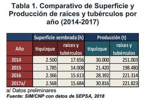 La producción de raíces y tubérculos en Costa Rica es cada vez más prolífera, llegando a alcanzar las 221.823 toneladas en 2017. Según la Secretaría Ejecutiva de Planificación Sectorial Agropecuaria, de las 15.684 hectáreas sembradas de raíces y tubérculos, el 16,37% estaban dedicadas al tiquizque, lo que produjo 30.816 toneladas de este desconocido.