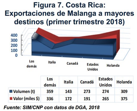 En el caso de la malanga, el volumen exportado llegó a las 1.359 toneladas, con un valor de 1,34 millones de dólares. Comparado con el año anterior, el volumen creció un 20,61%, aunque el precio promedio bajó un 13,24%. Las exportaciones fueron dirigidas a 15 países, figurando como principal destino Holanda con el 22,76% del total, seguido por Estados Unidos con el 20,20% y en tercer lugar Canadá, que recibió el 20,09% del volumen total exportado.