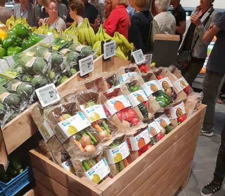 A finales de septiembre, Delhaize abrió su primera tienda renovada en Nijvel, Bélgica. "Cambiamos completamente la distribución de la tienda. Cuando la gente entra, ve inmediatamente la fruta de snack. También se hace un mayor énfasis en lo ecológico. Estamos dándole más visibilidad a los productos ecológicos, agrupándolos por códigos de colores, para que los clientes puedan encontrar fácilmente nuestros productos en toda la tienda", dice Sven van de Voorde, de Delhaize. La empresa también ha cambiado el envase de frutas y hortalizas ecológicas. “Cuando es posible, intentamos vender nuestros productos ecológicos sin envase, a menos que beneficie la vida útil del producto. Ahora vendemos sin envase zanahorias en varios colores, escorzonera y alcachofa de Jerusalén”.
