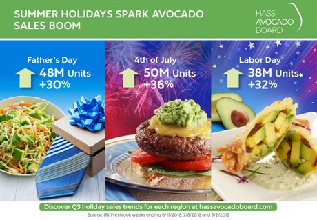 El Hass Avocado Board (HAB) acaba de publicar su informe Holiday and Events para el tercer trimestre de 2018, que detalla el comportamiento de la categoría del aguacate en el retail en los Estados Unidos durante el Día del Padre, el 4 de Julio y el Día del Trabajo. Parece que las ventas para el 4 de Julio continuaron creciendo hasta alcanzar la cifra más alta en cuatro años, casi 53 millones de dólares en ventas y 50 millones de unidades. Todas las regiones han mostrado un crecimiento muy marcado, desde el 10% de los Grandes Lagos al 54% del Noreste.