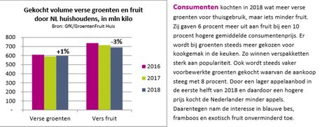 En 2018, el consumidor gastó un 5 por ciento más en frutas y hortalizas frescas para uso doméstico. Los holandeses compraron algo más de hortalizas frescas (+ 1%), pero menos fruta fresca (-3%). Para el consumidor, el precio medio de un kilogramo de fruta fresca fue un 10 por ciento más alto, por lo que el gasto en la compra de fruta aumentó un 6 por ciento. En concreto las manzanas fueron más caras debido a la baja oferta en la primera mitad de 2018, lo que se tradujo en una bajada del 10% en su compra. Esto demuestra que el precio del producto influye en los hábitos de compra. Las manzanas representan el 20 por ciento de la compra total de fruta, lo que significa que una disminución provoca un impacto importante en la compra total de fruta. El sector hortofrutícola teme que el aumento del IVA de las frutas y hortalizas tenga un efecto negativo en las ventas, especialmente para los consumidores con menor capacidad económica. Es precisamente este grupo el que tiene más dificultad para consumir la cantidad diaria recomendada de frutas y hortalizas.
