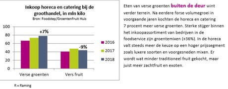 En volumen, la compra de hortalizas frescas en el sector de la hostelería aumentó un siete por ciento, lo cual supone una desaceleración después de un fuerte crecimiento en los años anteriores. El sector hostelero elige cada vez más productos de lujo, como los tipos premium y las mezclas precortadas. La explicación se basa en la creciente presión sobre los chefs para que sean originales con los menús sin mucho trabajo adicional, y al equilibrio entre porciones suficientes y menos desperdicios. Sigue creciendo la demanda de arándanos y frambuesas, y la industria de la restauración está sorprendiendo cada vez más a sus comensales con el uso del mango.
