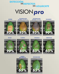En el caso específico del aguacate, se puede detectar y diferenciar defectos como la roña, quemadura de sol, gusano barrenador, alga, clavo, viruela, varicela, daño mecánico y rozadura. Para obtener un mejor resultado en esta clasificación, se recomienda que la clasificadora se encuentre en condiciones óptimas de calibración, iluminación y limpieza.