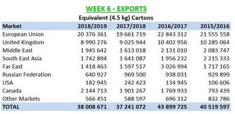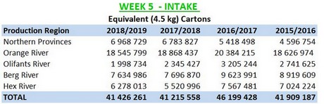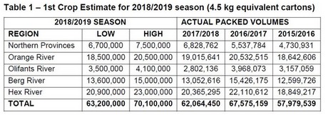 Las dos regiones tempranas de la Industria Sudafricana de la Uva de Mesa (SATI), las provincias del norte y el río Orange, casi han acabado de envasar. La primera estimación de cosecha para la campaña 2018/2019 sigue sin cambios, con volúmenes estimados entre 63,2 y 70,1 millones de cajas (de 4,5 kg). Parece que se va a alcanzar el límite medio-bajo de la estimación de cosecha.