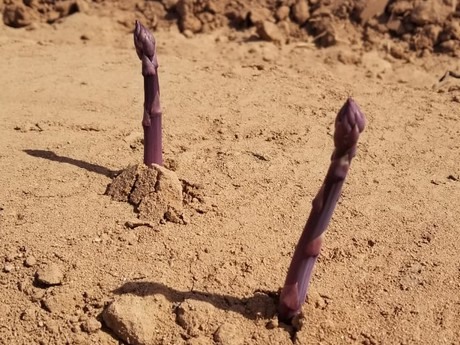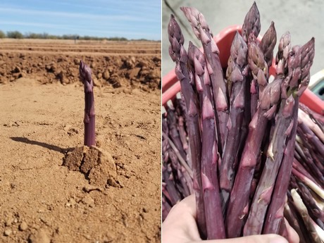 "Esta es la primera temporada que plantamos espárragos morados y es solo una pequeña prueba", aclara Bram Hulshoff, de Desert Farms. "Es una temporada muy corta, solo dura unas cinco semanas, y también empieza cerca de un más tarde que la temporada de espárrago verde. Que la temporada sea corta se debe a que es la primera cosecha de este cultivo".