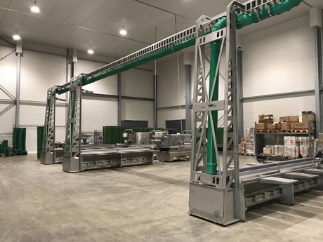 Las mesas de procesamiento están conectadas a un sistema de tuberías. En intervalos de configuración o cada pocos minutos, los residuos de las mesas se extraen automáticamente de la siguiente manera: los residuos de las hortalizas caen sobre la banda inferior y el producto terminado y listo para envasar circula en la cinta transportadora superior hacia la instalación de envasado. Debido a la estructura modular del proceso, es posible instalar varias mesas de trabajo, donde todo se extrae automáticamente.