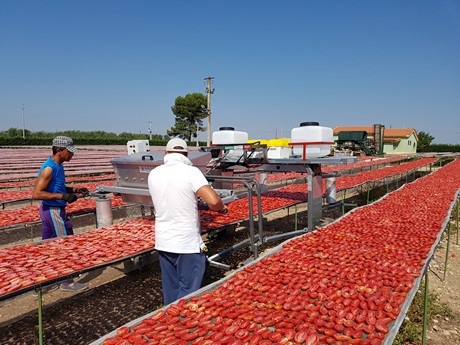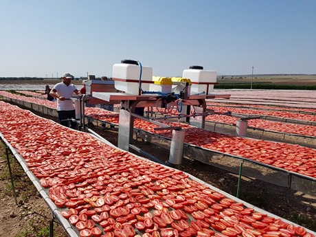 En principio, los tomates se secan durante 40 días, desde mediados de julio en adelante. "Nuestra máquina se utiliza para humedecer el producto rociándolo con agua limpia e, inmediatamente después, la sal se distribuye y se adhiere uniformemente, gracias al agua rociada. De esta manera, se utiliza menos sal y se obtiene un mejor resultado, porque la uniformidad de la distribución mantiene el color de la materia prima sin cambios". La máquina funciona con baterías y es totalmente automática.