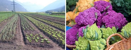 Izquierda: campo de cultivo en el valle de Imst; derecha: coliflores de colores