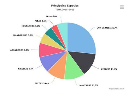En cuanto a especies las principales frutas enviadas a la fecha al mundo son: uvas de mesa, cerezas, manzanas, paltas, ciruelas y arándanos. La fruta que presenta el mayor incremento es la ciruela, ya que, uvas, cerezas y manzanas registran bajas en consideración a la anterior temporada.