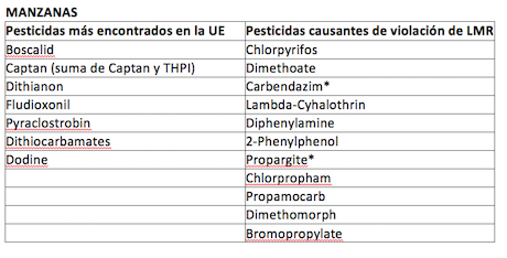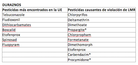 Un reciente informe de EFSA (European Food Safety Authority), proporcionó los resultados de control oficial llevadas a cabo por los estados miembros de la Unión Europea (UE) durante el 2018 en manzanas y duraznos que provienen desde la UE y de países no europeos. Este informe expuso que en manzanas, de un total de 1680 muestras analizadas, 614 no presentaron hallazgos de pesticidas, 1020 sí resultaron con hallazgos de pesticidas, y 46 presentaron violación de LMR. En el caso de los duraznos, de un total de 1178 muestras analizadas, 262 no presentaron hallazgos de pesticidas, 893 resultaron sí, y 46 presentaron violación de LMR.