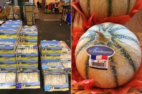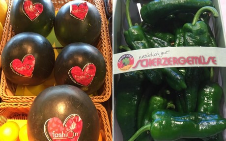 Dos especialidades de la gama actual de productos: a la izquierda, las sandías Fashion de España; a la derecha, los pimientos de Padrón de Franconia, que están completamente sin tratar (calidad ecológica).