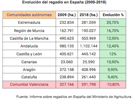 Efectivamente, el último informe sobre la evolución del regadío elaborado por el Ministerio de Agricultura desvela que a lo largo del período comprendido entre los años 2009 y 2018 la superficie agraria valenciana dedicada a producciones que precisan riego experimentó un descenso del 10,8%, al pasar de las 327.166 hectáreas existentes en 2009 a las 291.798 contabilizadas en 2018. El dato, ya bastante elocuente de por sí, resulta todavía más preocupante si se tiene en cuenta que en el resto de regiones españolas, donde el regadío también cuenta con una fuerte implantación, la tendencia fue justo la contraria, ya que el suelo agrícola –tal como se detalla en el cuadro que acompaña esta información– que usa riego creció en todas ellas y en algunos casos de manera muy significativa. Los mayores incrementos de esta variable se registraron en Extremadura (+20,7%) y Murcia (+16,7%), según el estudio del Ministerio de Agricultura.