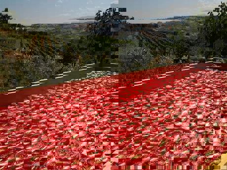 Giovanni Palumbo comenta: "Los tomates que procesamos vienen de alrededor de 40 hectáreas de terreno, solo en parte de nuestra propiedad. Es una producción de bajo rendimiento por hectárea, que cultivamos de forma natural. Los terrenos de cultivo están esparcidos por parcelas pequeñas y, por esto, todavía no podemos crear una cadena de suministro con certificación ecológica".
