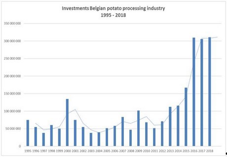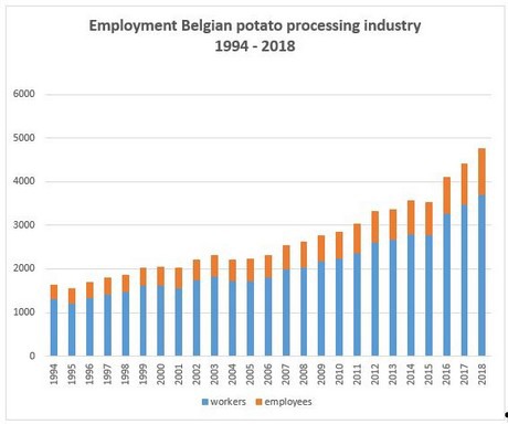 Belgapom, la asociación para la industria belga de comercio y procesamiento de patatas, ha anunciado que en 2018 se superó la marca de 5 millones de toneladas de patatas procesadas. Es un nuevo récord y lo que lo hace aún más notable es que es el mayor incremento anual desde los años 90. Como recordatorio: en 1990, alrededor de 500.000 toneladas de patatas se transformaron en patatas fritas, puré de patatas, patatas fritas de bolsa o copos y gránulos. 28 años después, el sector puede reportar un incremento del 1.000%.