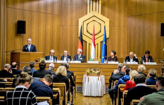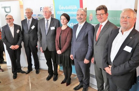 De izquierda a derecha: István Nagy (Ministro de Agricultura de Hungría), Hans-Jürgen Best (Departamento de Planificación de la Ciudad de Essen), Thomas Schlich (Director General de Landgard Obst & Gemüse GmbH & Co. KG), Prof. Hubert Schulte-Kemper (Presidente de la Junta de Fakt AG), Dra. Petra Ponvács-Pana (Subsecretaria de Estado para Asuntos Económicos de Hungría), Mihály Varga (Presidente de Kesz Holding Ltd), Zsolt Jamniczky (E.ON Hungría)