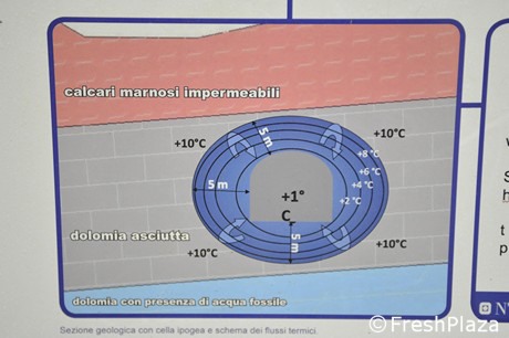 La roca de dolomita, la dolomía, es uno de los mejores aislantes naturales. Al enfriar el interior de las cámaras, la roca absorbe el frío y lo convierte en "frigorías" (la unidad de medida del frío) sin la necesidad de un mayor gasto de energía. Además, la dolomía, a unos 300 metros de la cima de la montaña, tiene una temperatura constante de 10 °C y llevar el ambiente a 1 °C es mucho menos costoso en comparación con las altas temperaturas que soporta un almacén frigorífico tradicional en la superficie.