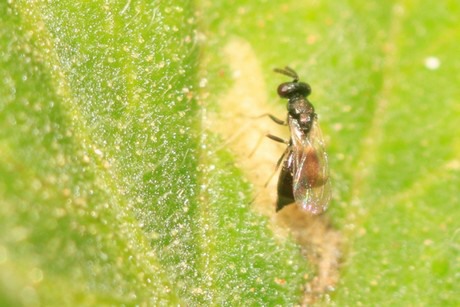 Hembra de Necremnus tutae punzando a una larva de T. absoluta a través del tejido de la hoja (Foto: Jan van der Blom)