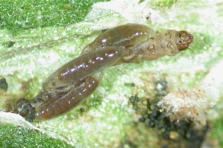 Larva muerta de T. absoluta, consumida lentamente por 3 larvas de Necremnus tutae (Foto: Jan van der Blom).