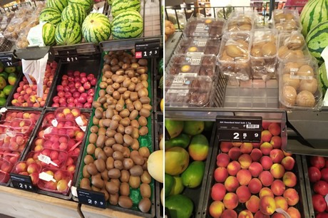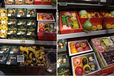 La presentación de la fruta también es bastante diferente cuando se comparan los supermercados de China y, por ejemplo, un país europeo. En China, la mayoría de los productos se envasan en plástico o cartón, aunque casi todos se sellan en plástico para preservarlos mejor y protegerlos de golpes. Además, se presta mucha atención al diseño del envase, pues es muy importante para las ventas, ya que a los consumidores chinos les importa mucho cómo se presentan los productos. En China es muy normal regalar fruta a alguien, por lo tanto, algunos envases de cartón con diseños especiales también son muy populares en el mercado. En Europa la situación es muy distinta, y no hay muchos supermercados que ofrezcan cestas de fruta preenvasadas para regalar.