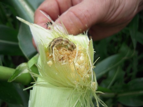 Gusano de la col (Helicoverpa armigera) en una mazorca de maíz