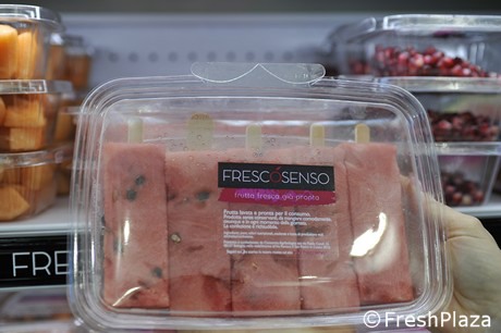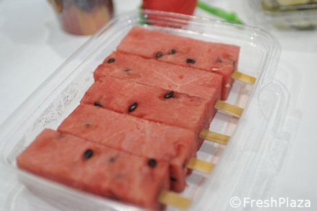 En Macfrut se presentó la sandía en palo: una tajada limpia de sandía, perfecta para calmar la sed y crujiente, que no libera mucha agua, atravesada por un palito, para ser consumida como si fuera un helado.