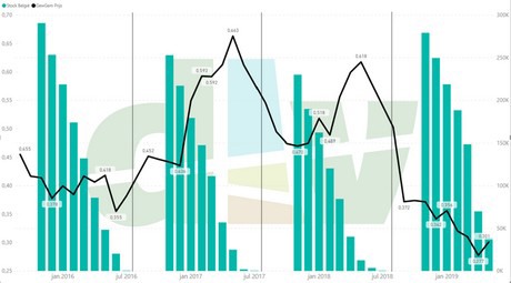 La figura muestra el precio promedio ponderado de las peras de las últimas 4 temporadas en relación con el stock disponible. El hecho de que el exceso de oferta lleva a precios bajos ya se podría haber predicho de antemano e incluso evitado si hubiera habido una mayor transparencia y consulta.