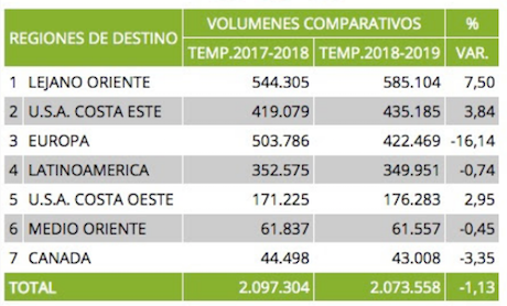 De esta forma en lo que va de la temporada 2018-2019 (01-09-2018 al 22-05-2019), las exportaciones de frutas frescas a los diferentes mercados de destino muestran una leve baja de los volúmenes (-1,13%) respecto al ejercicio anterior, totalizando 2.073.558 toneladas.
