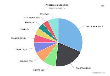 En lo que va de la Temporada 2018-2019, las principales frutas exportadas por Chile son uvas de mesa con 651.089 t, siendo el principal mercado de esta fruta Estados Unidos (293.515 t). Luego siguen las manzanas con 422.395 t, principalmente enviadas a Latinoamérica (177.313 t).