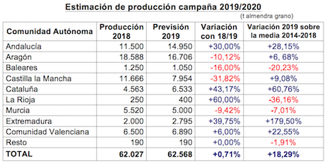 La Mesa Nacional de Frutos Secos ha realizado la primera estimación de producción de almendra para la campaña 2019, dando como resultado una previsión de 62.468 toneladas de almendra grano, lo que supone un leve incremento de la producción de un 1% más con respecto a la cosecha de la campaña pasada.