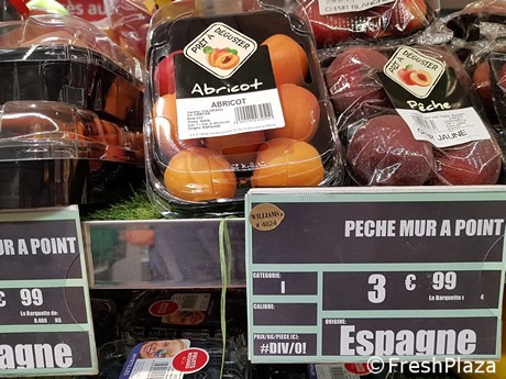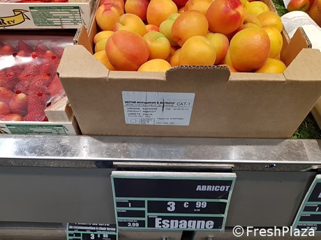 Había gran disponibilidad de albaricoques, con una procedencia igualmente repartida entre España y Francia. Los albaricoques españoles a granel de buen calibre y buena apariencia estaban a la venta por 3,99 euros/kilo. También había albaricoques envasados en bandejas de 6 frutas, con un peso de 400 gramos en total, variedad Colorado, en este caso a 3,99 euros la bandeja.