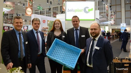 El equipo de bekuplast en Fruit Logistica (desde la izquierda): Jörg Kampherbeek, Jürgen Schultz, Melissa Zwartscholten, Georld Wilms, Grzergorz Czajkowski.