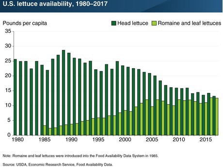 En 2017, hubo disponibles para consumo 6 kilos por persona de lechugas acogolladas frescas (iceberg, mantecosa, Boston y Bibb), según los datos de Food Availability de ERS. Este tipo de lechugas ha bajado un 54 por ciento desde el máximo de 13 kilos por persona de 1989. Por el contrario, la disponibilidad de lechugas romanas y de hoja (como las lechugas de hoja roja y verde) se ha incrementado, alcanzando 5,7 kilos por persona en 2017, desde los 1,5 de 1985, y casi igualando al de lechuga acogollada. La popularidad creciente de las ensaladas envasadas listas para consumir ha contribuido al aumento de la disponibilidad de lechugas romanas y de hoja. ERS calcula anualmente los suministros nacionales disponibles para el consumo interno. Los datos de este gráfico proceden de Food Availability (Per Capita) Data System.