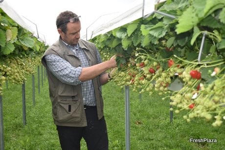 Ralf Hensen entre las mesas de cultivo que están en uso en aprox. 10 hectáreas. "La irrigación para este tipo de cultivo es todo un reto. Afortunadamente, estamos bien posicionados en cuanto a la ubicación. Además, también creo que el rango de variedad cambiará lentamente. En los campos que se han utilizado durante mucho tiempo, las variedades de fresas holandesas no funcionan tan bien como las variedades italianas", dice Hensen.