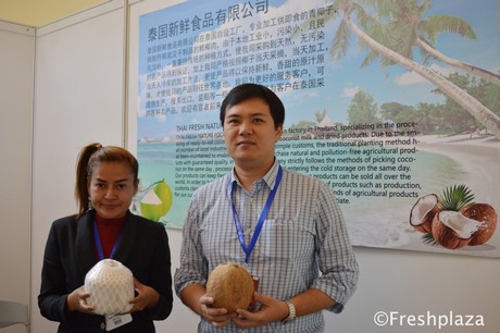 En la Shanghai Asia Fresh Expo participaron muchas empresas este año, la mayoría nacionales, pero también algunas empresas presentes en el extranjero. Una de dichas empresas fue Thai Fresh Nature Food Co., Ltd., procesadora y exportadora de cocos tailandeses. "Nuestra empresa tiene sede en Tailandia y exportamos nuestros cocos a clientes de todo el mundo. Por ahora estamos abasteciendo al mercado chino, al cual suministramos 6 meses al año. Comenzamos en abril y mayo, pero el volumen de exportación seguía siendo un poco bajo, por lo que ahora los volúmenes han aumentado. La demanda de cocos en China es muy buena, especialmente en verano, y está aumentando. Durante el invierno, no abastecemos al mercado chino, porque aunque todavía hay cierta demanda, no hay tanta como en verano".