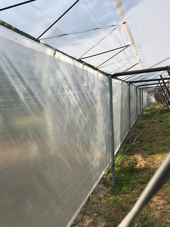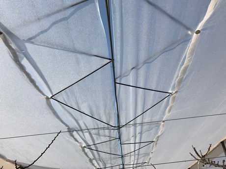 "Es precisamente en los meses de primavera (abril y mayo) cuando nuestro innovador sistema de cobertura podría convertirse en una solución ganadora y segura. La gestión del corredor de ventilación central es muy simple. Durante la floración, es necesario controlar la temperatura diurna y nocturna. No debe superar los 30 °C, por lo que el grado de abertura del corredor central debe regularse de acuerdo con las condiciones meteorológicas. La abertura parcial o total del corredor central se realiza con un simple movimiento manual de los bordes exteriores de la lámina. Las posiciones elegidas se mantienen firmes debido al efecto de fijación que se obtiene entre el elástico y el gancho de botón. En la fase de crecimiento de las plantas y en la de los frutos, es preferible utilizar la abertura central máxima de 1 metro, para gestionar mejor no solo las temperaturas, sino también la ventilación".