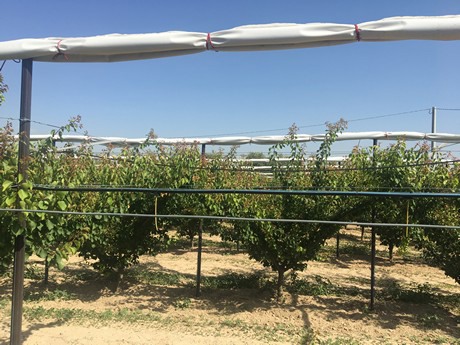 En el área de Cerignola (Foggia, Apulia), en mayo de 2019: plantación de albaricoques con cubierta protectora de Retilplast