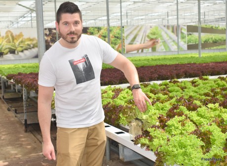 Marcel Schütze muestra lechuga fresca, producida verticalmente